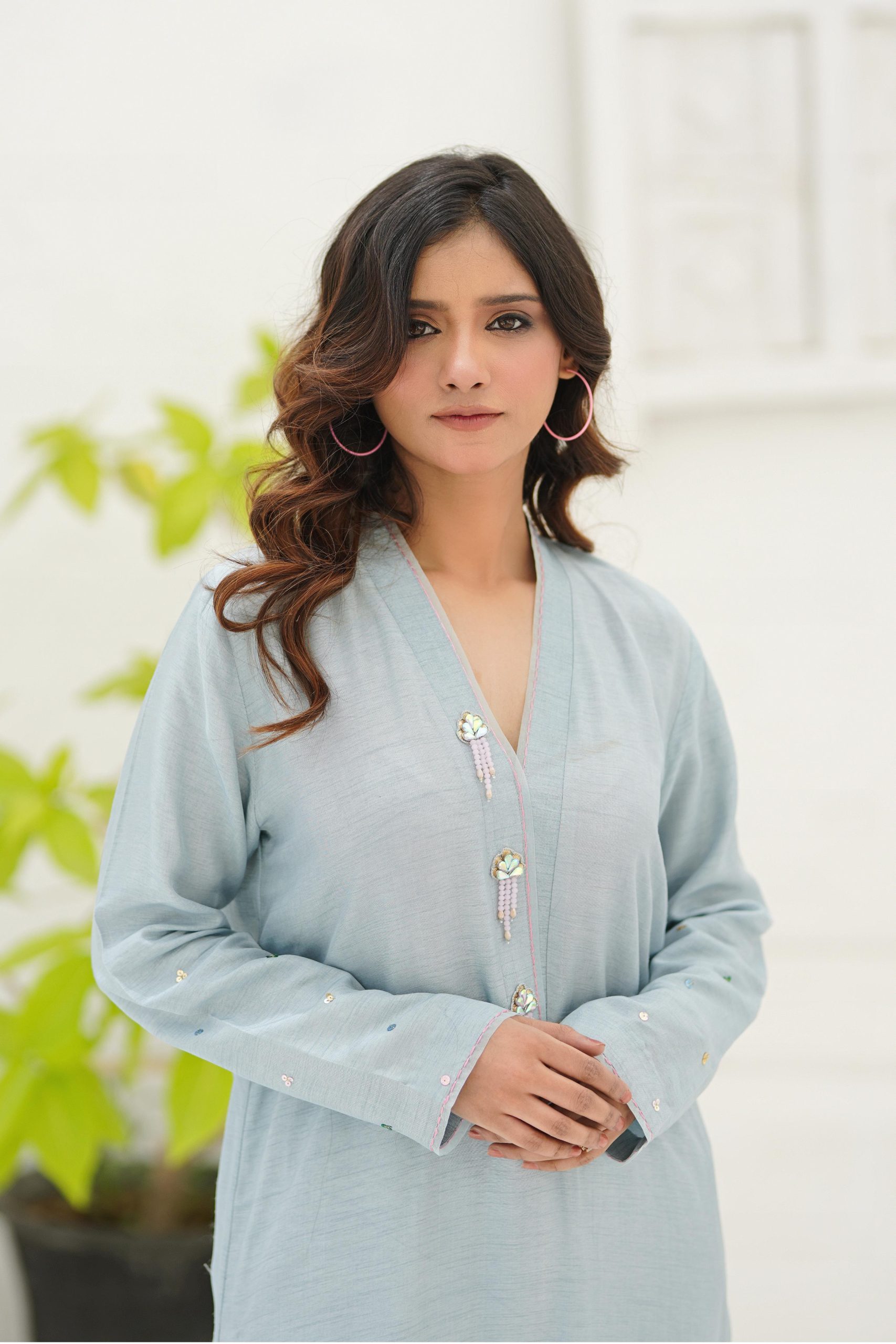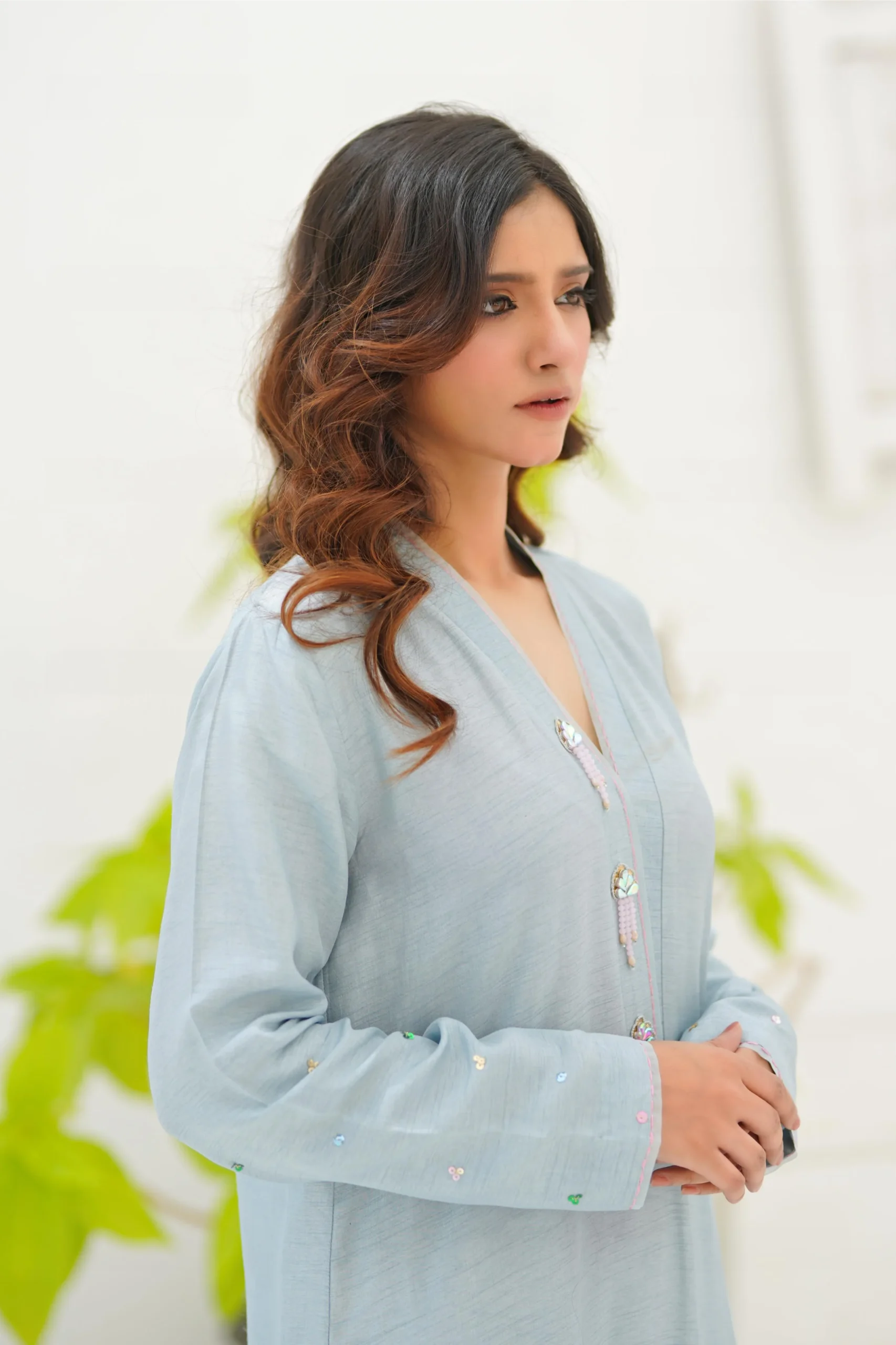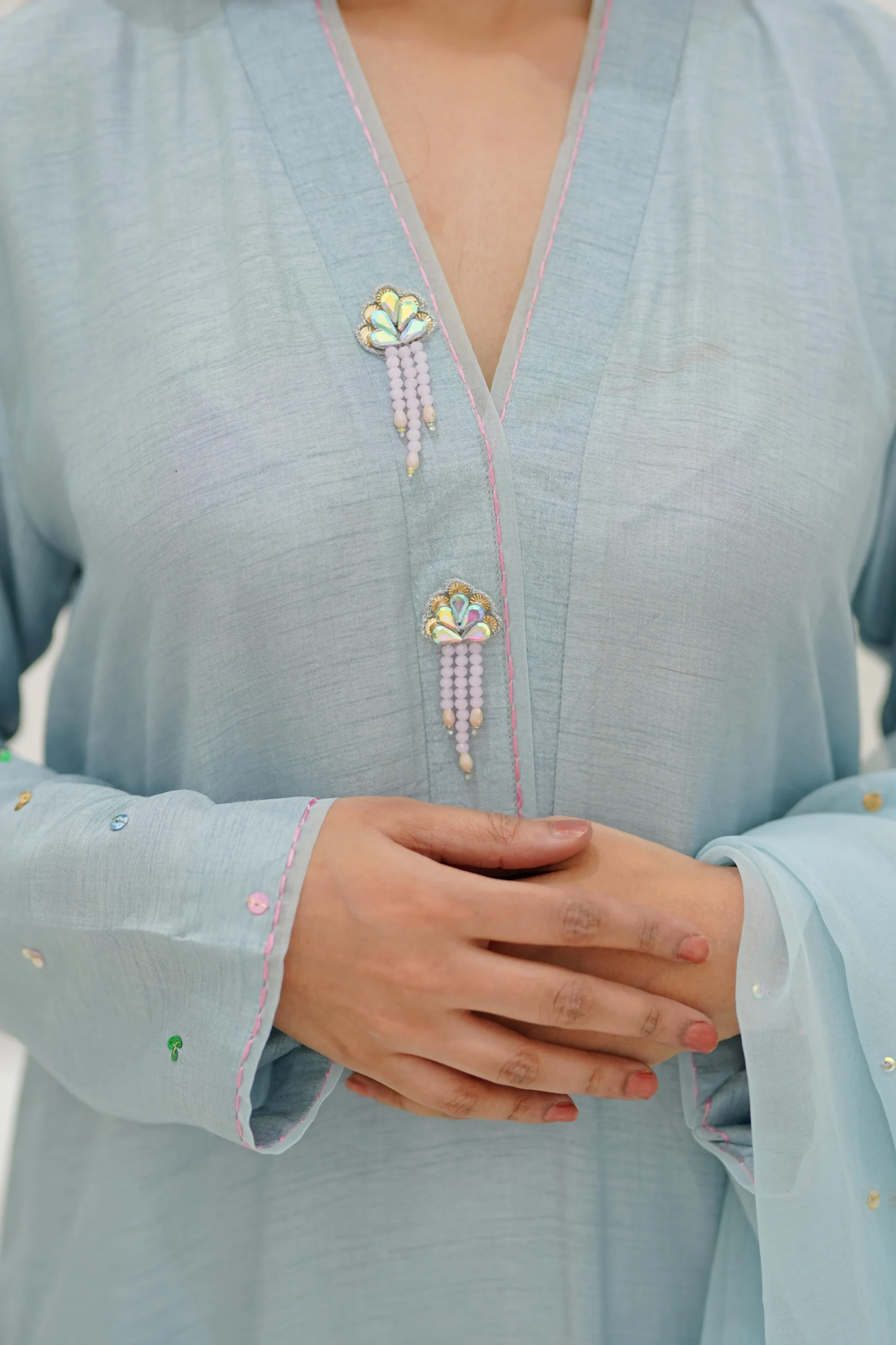Sky blue raw silk meets pink sequins and Swarovski magic in this celestial dress perfect for weddings, galas, and fairytale events