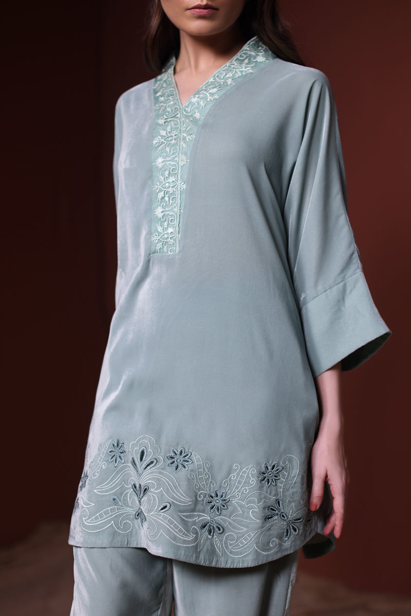 Elevate your wardrobe with Minted in Style, a stunning mint green velvet ensemble that embodies elegance. The shirt features exquisite embroidery and stylish balloon-cut sleeves, offering a unique silhouette that flatters every figure. Paired with a plain velvet shalwar, this outfit exudes sophistication, while the beautifully embroidered organza dupatta adds a touch of ethereal charm. Perfect for special occasions.